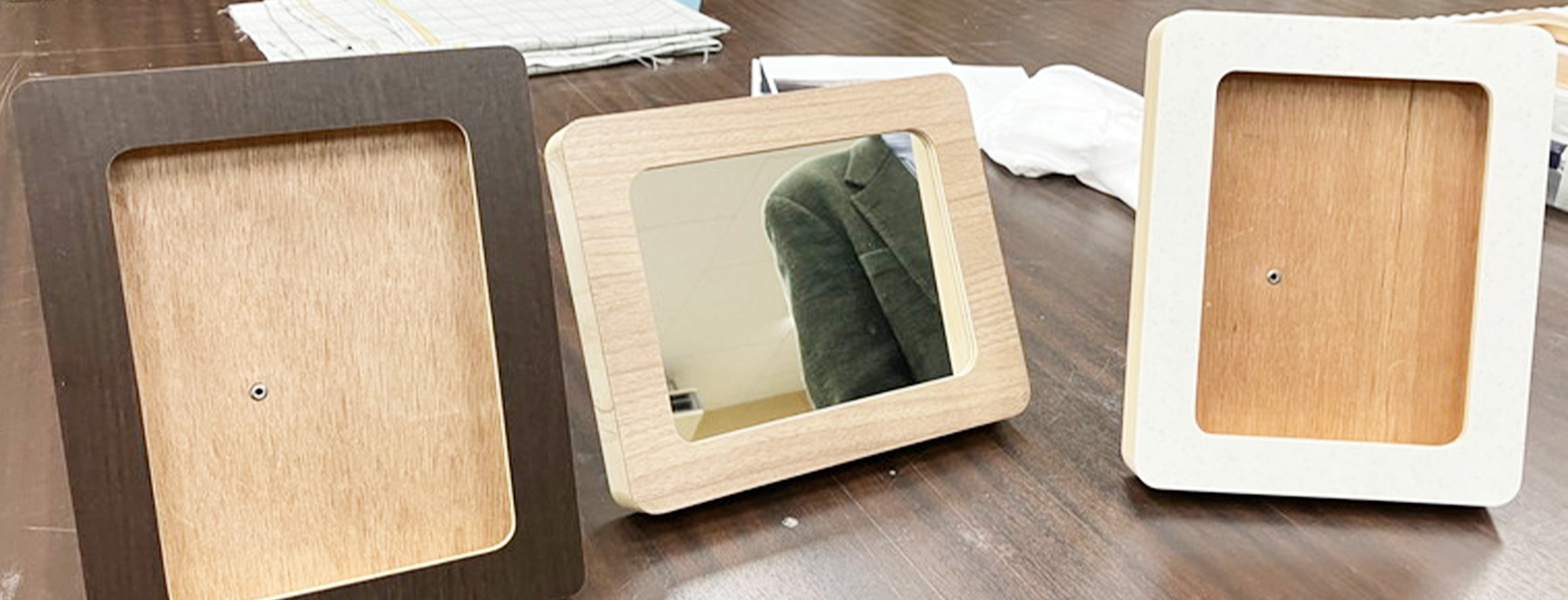 生徒さんには1日ずつ家具・ミラー製作を体験いただき、最終日には卓上ミラーの木製枠と中のミラーを組み立てて完成品をお土産としてお持ち帰りいただきました。初めての経験ばかりの作業は新鮮で楽しい時間だったようで、例えばミラー製作では、フィルム下にある板にアルミテープを空気が入らないようにきれいに貼る工程に苦労しながら、職人技術の難しさを実感していました。また家具部品の運搬や組み立てでは、その重さに苦戦しながら慎重に取り組む一方で、梱包作業は楽しんでいるようでした。