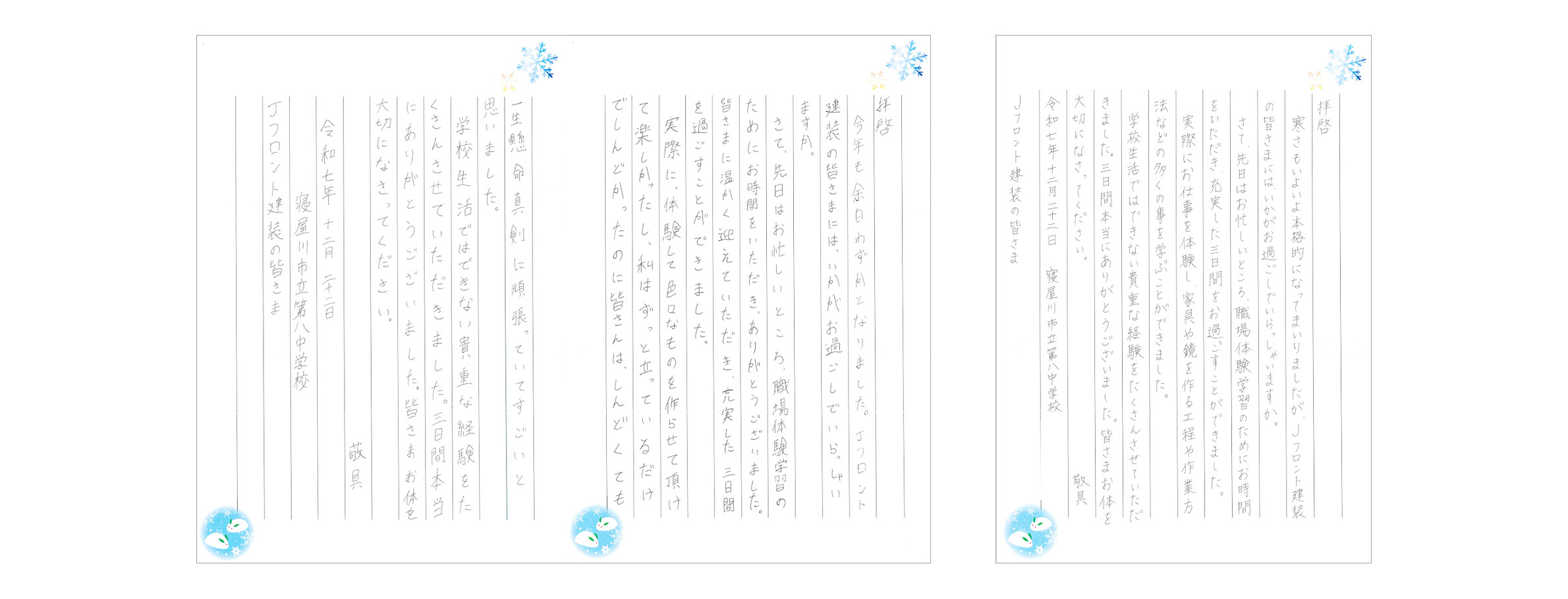 昨年度より、当社では地域の中学生を対象に職業体験の受け入れを行っています。本年度も大阪工場において、寝屋川市立第八中学校2年生の女子生徒さん2名を迎え、家具やミラー製作など、ものづくりの現場を3日間体験いただきました。「モノづくりが好き」「お父さんが家具職人」というきっかけで参加してくれたお二人は、初めて触れる製造作業に興味津々で、真剣に取り組む姿が印象的でした。